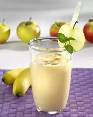 Peel the bananas, cut them into pieces and sprinkle with lemon juice. Puree with the buttermilk, apple juice and sea buckthorn juice in 2 portions in a blender. Divide into 4 glasses. Lightly roast the flaked almonds in a pan without fat and sprinkle into the glasses. Serve decorated with apple slice and mint leaf
