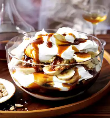 Put some cream in a large bowl. Layer some banana slices, some butterscotch sauce and some muffin pieces on top. Drizzle with a little brandy. Continue like this until all ingredients are used up.