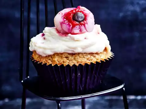 Whip cream cheese with icing sugar. Stir the raspberry juice and the rest of the raspberries into the cream cheese. Spread the muffins with the cream and decorate with the lychee eyes.