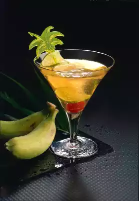 Mix banana liqueur, white rum and lime juice. Pour into a champagne glass and fill up with chilled champagne. Put the coctail cherry, lime and banana slices on a skewer and pour into the glass.