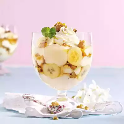 ##Whip the cream until stiff and allow the vanilla sugar to trickle in. Fold a good half into the pudding. Cut ##bananas## into slices and sprinkle with lemon juice immediately. Layer the pudding, honey nuts and banana slices in glasses. Decorate with the rest of the cream and ##mint##.