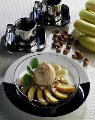 Form ice cream into balls and arrange on plates with the fruit. Sprinkle with cinnamon and hazelnut leaves. Decorate with lemon balm.