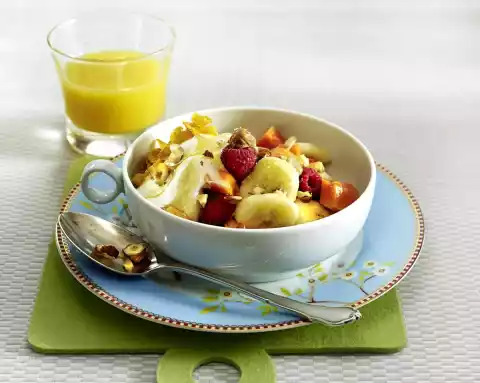 Peel and slice the bananas and sprinkle with lemon juice. Spread fruit, nuts and cornflakes in 4 bowls and mix. Add yoghurt and honey to the muesli before serving.