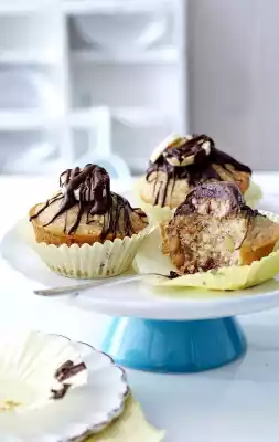 Roughly chop the chocolate and melt over a warm water bath. Cut 12 slices (approx. 1/2 cm thick) from the banana. Place 1 slice of banana on each muffin. Add chocolate with a spoon.