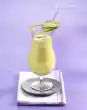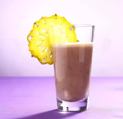 Pour into 2 glasses and serve immediately garnished with 1 pineapple slice each.