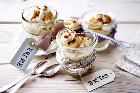 Stir the pudding until smooth. Whip the cream until stiff, set aside 2 tablespoons of cream. Fold the rest of the cream and brittle into the pudding, except for a little bit for sprinkling. Turn bananas in cinnamon-sugar. Divide about half of the pudding into 4 glasses (approx. 350 ml each), add about half of the bananas.