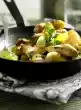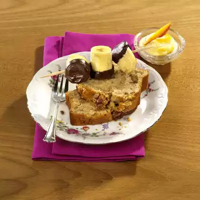 Chop 75 g walnuts. Peel bananas, cut into pieces and sprinkle with lemon juice. Cream 100 g sugar, brown sugar, vanilla pulp and fat. Stir in curd, eggs, banana pieces and chopped walnuts. Mix flour, baking powder and cinnamon and sieve over the banana mixture.