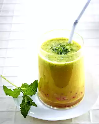 Put half of the pomegranate seeds, 2 whole mint leaves, bananas, orange juice and mango nectar in a blender and puree finely. Put the rest of the pomegranate seeds in 2 glasses, pour in the smoothie and decorate with the sliced mint