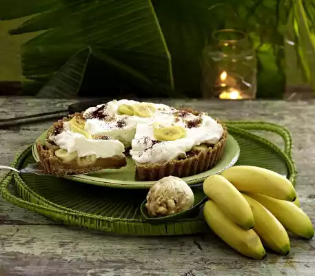 Open the still warm tin, spread toffee mixture on the floor and smooth it down. Peel and slice the bananas, mix with lemon juice and spread on the tart. Chill for about 1 hour
