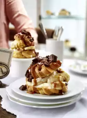 For the filling, whip the cream until stiff, add vanilla sugar. Peel and slice the bananas. To serve, cut the eclair bags horizontally. Spread the cream and bananas in the lower halves.