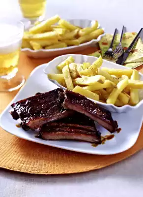 Bake French fries in hot fat according to package instructions. Remove and season with salt and a little pepper. Arrange ribs and French fries on plates and serve immediately