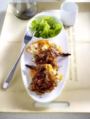 Take the wings out of the oven, turn them over and brush with the rest of the marinade. Slide onto the lower rail of the oven. Slide the potatoes over the chicken wings in the hot oven and bake for 15-20 minutes. If necessary, change the grid and tray in the last 5 minutes. Serve with a green salad