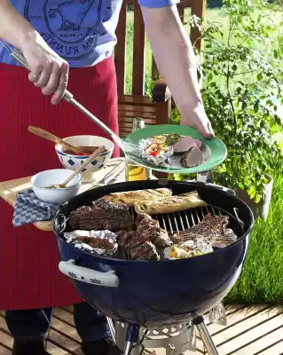 Preheat the grill (takes 25-30 minutes until the coal/briquettes are covered with a white layer of ash). Then push the charcoal aside to the right and left (for some appliances there is a charcoal holder). Now place an aluminium bowl in the middle of the grill, possibly with a shot of water, beer or wine. Now place the barbecue food. Steaks for direct grilling over the charcoal, pork fillets and tortilla rolls for indirect grilling over the aluminium bowl. Distribute the packets with the vegetables in between. The closer the food is to the grill, the longer the grilling times