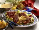 Just before serving, melt 1 tablespoon of fat. Sauté the vegetables in it. Add barley and chives. Season to taste with salt and pepper. Slice Parmesan cheese over it. For the sauce, sauté the remaining shallots and capers in 1 tablespoon of melted fat.