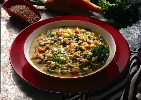 Clean, wash and dice soup greens and parsley roots. Peel and halve the onion, pin bay leaves and cloves on the cut surface. Wash the barley and let it drip off. Heat the oil in a pot. Brown the soup greens and the barley in it. Fill up with 1 1/2 litres of water.