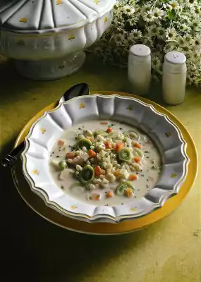 Clean, wash and cut the soup greens into small cubes. Peel and finely dice the onion. Wash the barley. Heat oil in a pot. Add soup greens, onion and barley and fry.
