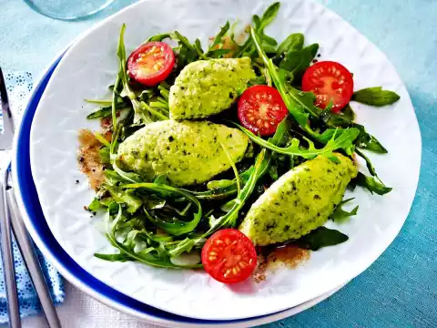 Wash and shake the basil dry, chop finely. Bring milk, butter, approx. 1⁄2 TL salt and some pepper to the boil. Sprinkle in semolina and stir with a wooden spoon until the mixture comes off the bottom of the pot.