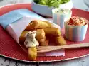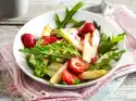 In the meantime, sort out the rocket, wash and drain well. Wash and halve the tomatoes. Mix vinegar, honey, salt and pepper. Fold in the oil. Mix rocket, tomatoes and vinaigrette. Arrange on four plates.
