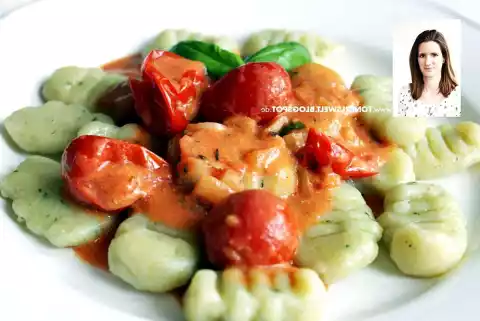 Gnocchi: Peel and quarter the potatoes and cook them in salted water. Put about 2 of the cooked potatoes with the basil in a blender and puree. Press the rest of the potatoes through a potato press.