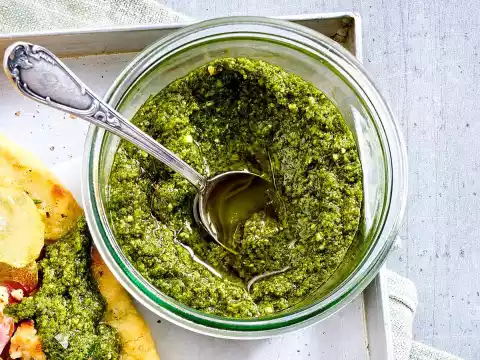 Is there any basil pesto left? Pour the leftovers into a glass with a twist-off lid and cover the pesto with a thin layer of olive oil. This way it will keep in the refrigerator for up to four weeks.