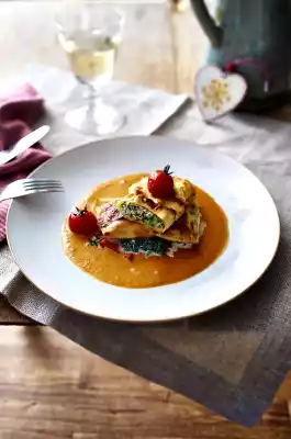 Preheat oven (electric cooker: 225 °C/circulating air: 200 °C/gas: see manufacturer). Whip 50 g cream until stiff, mix with parmesan. Spread spinach in portions on a baking tray. Place roulades on top.
