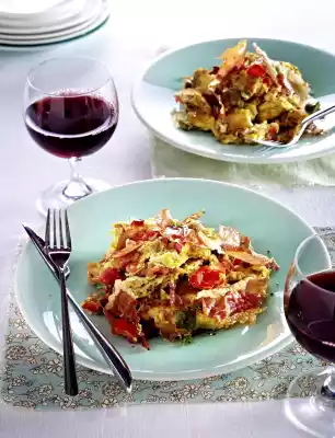 Beat the eggs. Season with salt and pepper. Stir in the tomato mixture. Put everything into a large pan and cook while stirring until the scrambled eggs are stiff