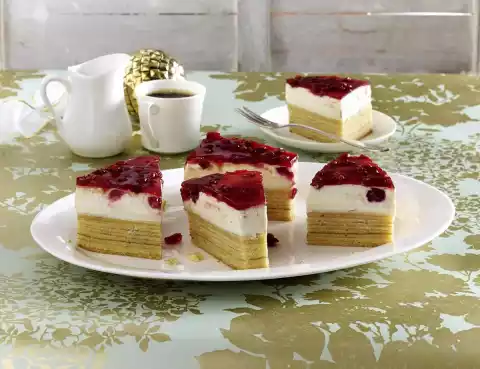Soak 4 gelatine leaves. Squeeze out the gelatine and dissolve in a pot over low heat. Carefully stir in 300 g cranberries. Spread the cranberry jelly on the surface of the cake and chill for another 2 hours. Remove the cake from the frame, cut into 3 strips and cut 4 trapezoidal pieces from each strip
