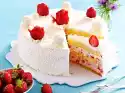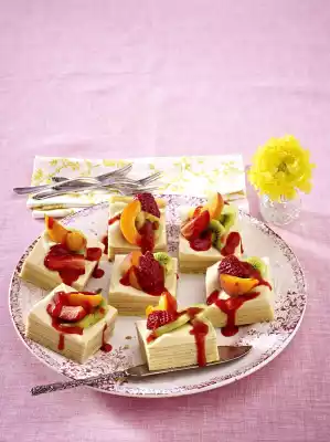 Cut the cake into about 30 pieces, cover with fruit and drizzle with strawberry sauce. Serve the rest of the sauce with it
