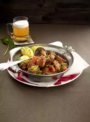 Dab meat dry and cut into cubes. Heat the lard in a roaster. Fry the meat in portions for approx. 5 minutes each while turning. In the meantime peel and wash the spring onions and cut them into rings. Fry half of the onion rings for the last 2 minutes. Deglaze with beer and stock, bring to the boil, season with caraway seeds and braise for about 1 hour, turning occasionally.