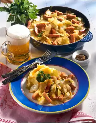 Peel, wash and cut the potatoes into small pieces. Cook in boiling salted water for about 20 minutes. Meanwhile clean the white cabbage, cut into quarters and remove the stalk. Cut quarters lengthwise into thirds and diagonally into rhombs.