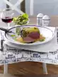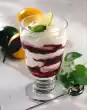 Clean, wash and chop the rhubarb. Mix 2 tablespoons cherry juice and starch. Steam rhubarb for about 5 minutes in the remaining boiling juice. Flavour with sugar. Bind. Peel and chop the banana and fold in. Turn out cream. Arrange everything