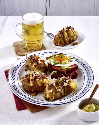 Take the potatoes out of the oven. Spread Obatzda in splodges on the potatoes. Sprinkle with pretzel crumbs and ham and bake at the same temperature for 5-7 minutes.