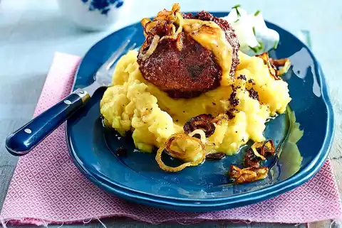 For the puree, peel and wash the potatoes and cook in salted water for about 20 minutes. For the meatballs, peel 1 onion and dice finely. Knead with minced meat, crumbs, 1 tsp. mustard, salt and pepper. Form 8 meatballs, filling each with 1 tbsp. cheese mixture. Fry in 2 tablespoons of hot oil for about 12 minutes.