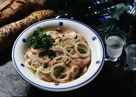 Peel the skin off the meat sausage. Cut the sausage into thin slices. Cut Regensburger into slices as well. Peel onions and cut into rings. Whip vinegar with mustard, salt, pepper and oil to a marinade. Chop parsley and add. Put the sausage and marinade in a bowl and let it stand for a short time