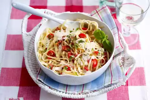 Cook the pasta in boiling salted water according to the instructions on the packet. Slice Parmesan cheese into shavings with a peeler. Drain the pasta and put it back into the pot immediately. Fold in tomato mixture and cheese.