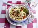 Wash, clean and dice the tomatoes. Prepare pasta in boiling salted water according to package instructions. Peel garlic and press it through a garlic press. Pluck Parma ham a little smaller.