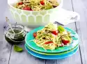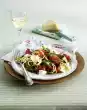 Fold in the tomato mixture and arrange on plates. Sprinkle with mozzarella and garnish with basil leaves.