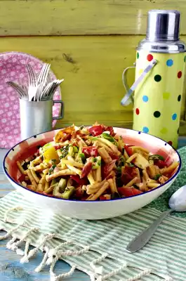 Prepare the pasta in boiling salted water according to the instructions on the packet, pour into a sieve, rinse with cold water, pour into a large bowl, drizzle with oil and put aside. Wash, halve, stone and slice the peaches. Clean and wash the peppers and cut them into cubes (approx. 3 x 3 cm). Clean, wash and cut spring onions into rings. Peel garlic and dice finely