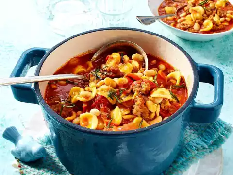Put the beans in a sieve and rinse with cold water. When the noodles are cooked, add the beans and briefly heat the stew. Season to taste with salt and pepper and serve.