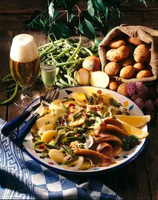 Wash the potatoes and cook in boiling salted water for 20 minutes. Quench cold, peel and let it rest for a while. In the meantime clean and wash the beans and cut them into bite-sized pieces. Cook in boiling broth for 15 minutes.