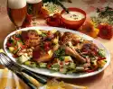 Season with pepper. Cut the potatoes into slices. Pour beans and hot broth over them. Cover and leave to stand for 30 minutes. Peel onions, cut one into rings, dice the rest finely. Dice bacon as well.