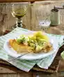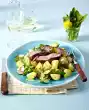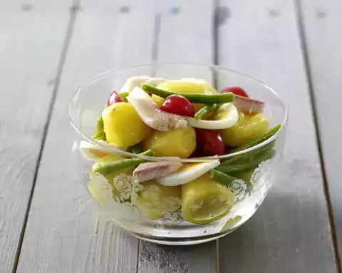 Fold in the oil. Wash and halve the tomatoes. Mix the potatoes, beans and tomatoes with the vinaigrette and leave to stand for about 30 minutes. Cut the trout fillets into pieces. Peel and slice the eggs. Carefully fold the eggs and fish into the salad and arrange in a bowl