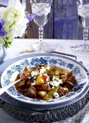 Wash and dice the tomatoes. Add the tomatoes about 30 minutes before the end of the cooking time (see picture below left) and braise. Season the stifado with salt and pepper. Crumble the feta over it.
