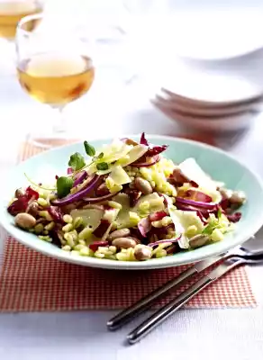 In the meantime, put the wheat in a pot of boiling salted water and cook for about 10 minutes. Drain and quench. Add the wheat to the beans. Mix vinegar and mustard, add oil. Season to taste with salt, pepper and a little sugar. Add half of the vinaigrette to the beans and let it steep for about 40 minutes