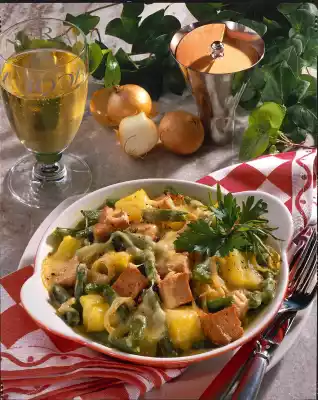 Wash the beans and break them into pieces. Peel and wash potatoes and cut into large cubes. Boil the beans, potatoes and broth. Wash the savory and add to the vegetables and cook for about 15 minutes.