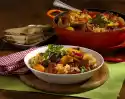 Deglaze with 3/4 litre water and braise covered for about 1 1/2 hours. Add the soaked and green beans 1/2 hour before the end of the cooking time. Clean, wash and slice the tomatoes and add them 10 minutes before the end of the cooking time. Refine goulash with cream and chilli sauce. Season again and serve