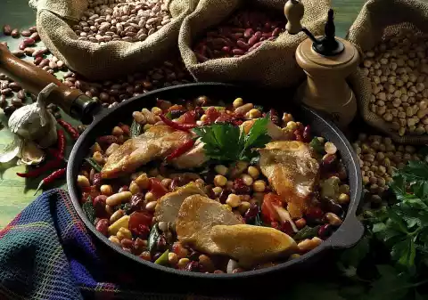 Wash the beans and chickpeas and soak them overnight in 1 litre of water. The next day, wash chicken fillets and dab dry. Clean and wash spring onions and cut them into bite-sized pieces. In a pan with hot oil, fry meat on both sides for about 5 minutes each. Add the white pieces of spring onion and fry briefly. Season with salt and pepper. Remove the chicken meat.