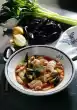 Put the soaked pulses with the soaking liquid into the pan and simmer covered for about 1 hour. Wash and clean 2 chillies and cut them into rings. Peel and finely chop the garlic. After 30 minutes cooking time add chili, garlic, chunky tomatoes and remaining spring onions and let simmer further. Season to taste with vinegar, salt and pepper. Cut the chicken fillets open and heat them up again on the pulses 5 minutes before the end of the cooking time. Serve garnished with parsley and remaining chillies