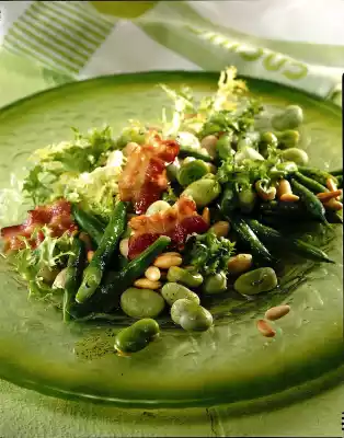 Cut the bacon slices into pieces and fry them crisply in a pan without fat. Remove and roast pine nuts in the pan until golden brown. Mix the beans with the lukewarm salad dressing. Line plates with frisée salad, arrange beans on top. Spread bacon and pine nuts over the salad