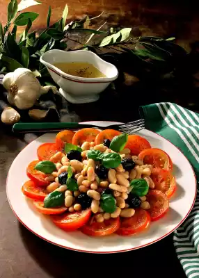 Put the beans on a sieve and rinse under cold water. Place in a bowl. Peel onions, dice finely and add. Peel garlic and press it through the garlic press or chop it finely. Mix vinegar, lemon juice, garlic, salt and pepper and add oil. Pour the marinade over the beans and leave to stand for about 1 hour. Wash and slice the tomatoes and place them on 4 plates. Fold the olives into the beans and arrange on the tomatoes. Garnish with basil leaves. Serve with a slice of farmhouse bread